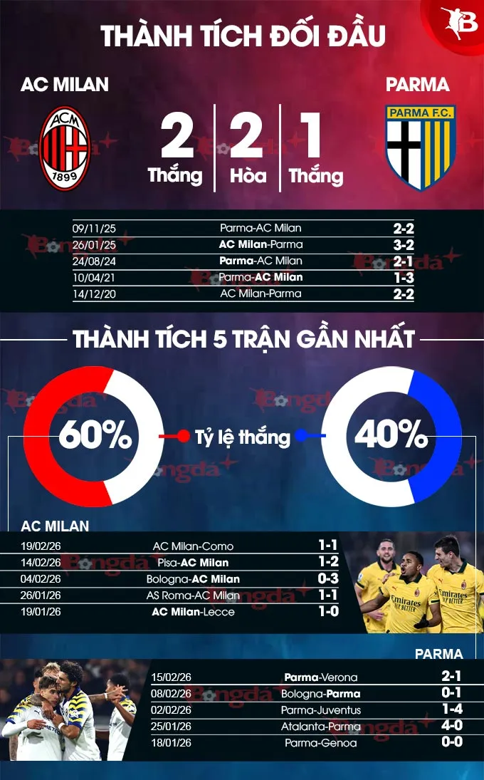 Lợi thế sân nhà là điểm sáng cho Milan với thành tích ấn tượng: 25 điểm sau 12 trận và đặc biệt là 8 chiến thắng trong 10 lần chạm trán gần nhất với Parma tại đây. Đây chính là nền tảng để Rossoneri tự tin hướng tới một kết quả tích cực.