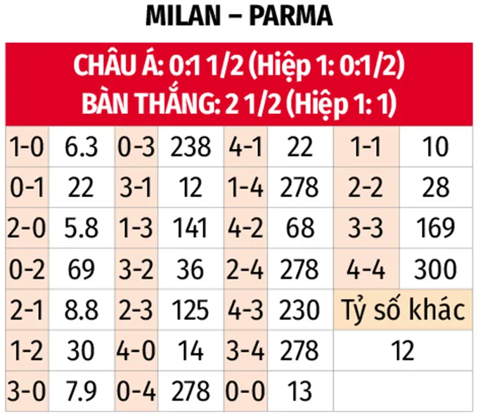 - Trận đấu nhiều bàn: Cả hai đội đều có xu hướng thi đấu sôi động. 2/3 trận gần của Milan và 3/4 trận của Parma ghi từ 3 bàn trở lên. Lịch sử đối đầu 6 trận gần nhất cũng chứng minh điều này.